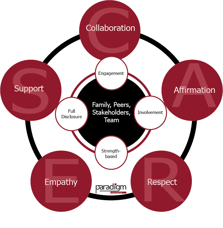 The C.A.R.E.S. Model represents this framework for how Collaboration, Affirmation, Respect, Empathy and Support wrap around our work and interactions with others.